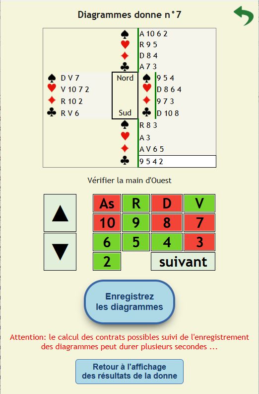 Le calcul des contrats possibles est réalisé lorsque les diagrammes sont entrés après le click sur le bouton "Enregistrez les diagrammes". Le calcul peut prendre quelques secondes. Sur l'écran des résultats, le clic sur le bouton "Analyse" dans le quart supérieur gauche des diagrammes affiche les contrats possibles dans chaque position, à sans-atout ou dans les couleurs, un tiret "-" signifie qu'il n'y a pas de contrat possible.